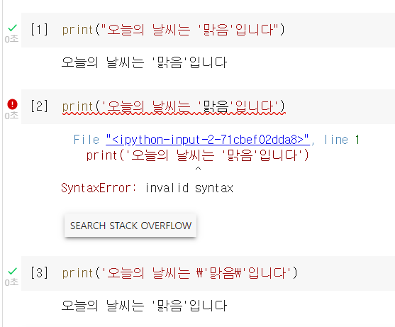 첫번째 문장은 작은 따옴표( ' ' )를 표현하기 위해서 큰 따옴표( " " )를 사용했습니다. 제대로 결과값이 도출되었습니다.