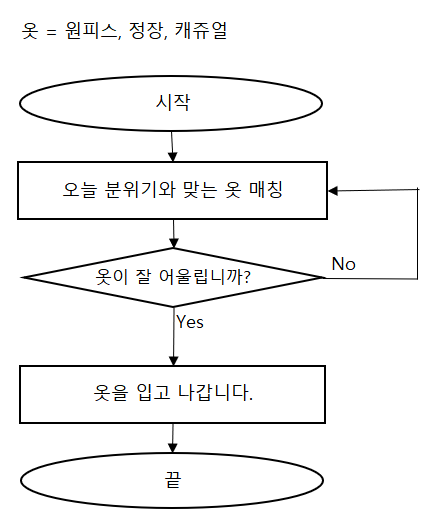 위에 상황을 알고리즘으로 표현해봤습니다. 여기서 반복문에 해당하는 것은 저 마름모꼴로 되어 있는 부분에서 Yes, No라는 작업이 이루어 지는 부분인데요, 컴퓨터는 저 질문에 의해 Yes를 True로 인식하고, No를 False로 인식하여 다음 단계로 넘어가게 됩니다.
