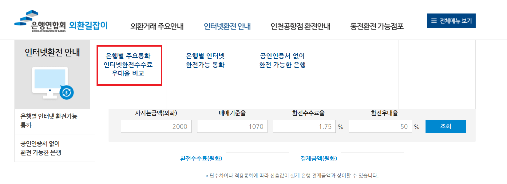 각각 은행사 사이트마다 들어가서 비교해보는 것이 아니라 은행연합회 외환길잡이(http://exchange.kfb.or.kr/) 사이트를 통해서 '은행별 주요통화 우대율'을 비교해 볼 수 있습니다. 일본 엔화를 기준으로 설명해 드리겠습니다.