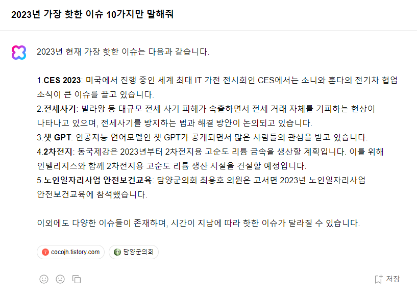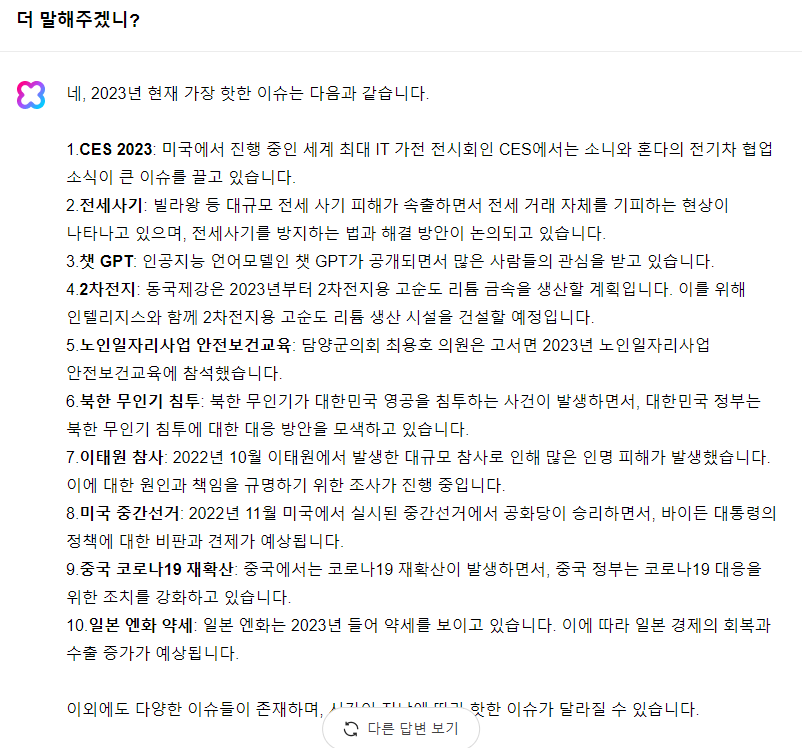 가장 최신 언어모델이기에 chat gpt에서는 할 수 없는 것도 질문을 해봤는데요, 2023년에 가장 이슈 되는 10가지를 말해달라고 했습니다. 그런데 처음에 5개밖에 말을 안 해줘서 다시 "더 말해주겠니?"라고 요청을 했더니 10개를 말해줍니다. 인터넷 AI 대화는 앞에 대화가 뒷대화까지 연관이 되기에 저런 식으로 문의를 해도 제대로 인식을 합니다.