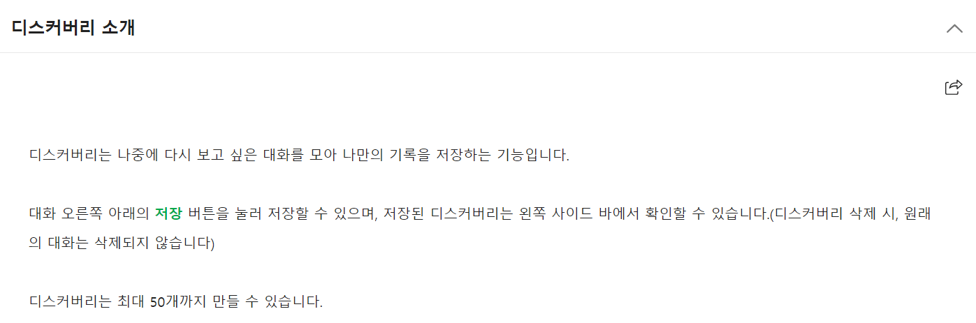 뿐만 아니라 디스커버리라고 하여 대화 중에 내가 저장하고 싶은 것들은 모아두는 기능이 있습니다. 대화 오른쪽 끝단에 보면 '저장' 버튼이 별도로 있는데, 그걸 클릭하시면 디스커버리로 넘어가게 됩니다.