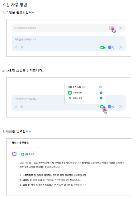 스킬 사용하는 방법은 대화창 옆에 스킬을 활성화할 수 있는 표시가 있습니다. 그 표시창이 파란색으로 바뀌게 해 주면 스킬이 활성화되어 있는 겁니다. 그 후에 네이버 쇼핑, 네이버 여행 2가지 전부 또는 1가지만 선택할 수 있습니다. 그 후 쇼핑과 여행에 관련된 대화를 진행하면 최신정보를 얻을 수 있습니다.