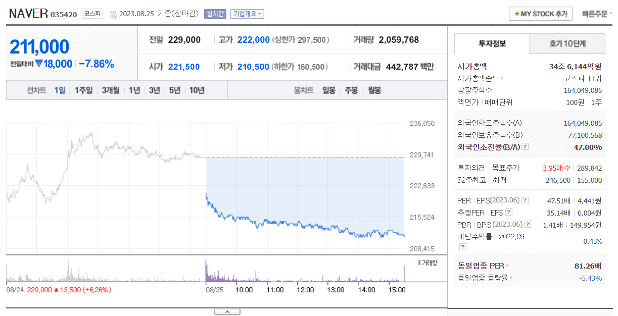 실제로 이번주 금요일 종가 기준의 네이버 주가자료입니다. 하이퍼클로바X가 공개된 이후에도 그렇게 큰 주가 상승을 이뤄내지는 못했습니다. 오픈 당시 오류도 있었고, 회피성 답변으로 사람의 기대에 못 미쳤기 때문입니다. 그러나 점점 더 개발을 해나간다면 상승의 여지는 확실합니다.