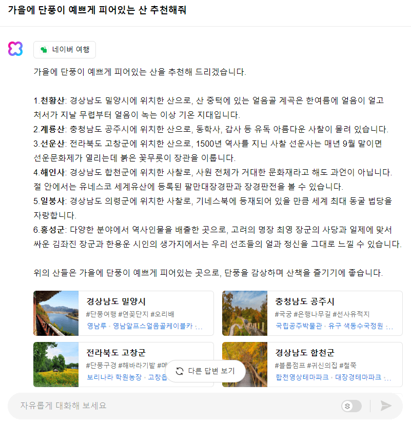 그리고 이번에는 네이버 쇼핑 스킬을 이용해 보겠습니다. 이제 곧 가을이 다가오니 가을 단풍 명소를 추천해 달라고 요청했습니다. 그랬더니 천왕산부터 홍성군에 있는 역사적인 장소까지 다양하게 추천을 해줬습니다. 실제로 밑에는 관련 url을 소개해주고, 누르면 바로 이동할 수 있게끔 만들어놓았습니다.