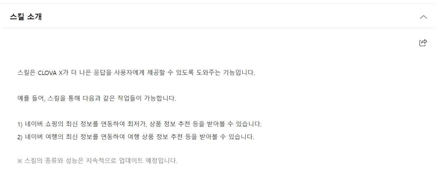 챗 gpt와 다른 하이퍼클로바x의 특징이 있다면 스킬이 있습니다. 네이버가 만든 언어 모델이기에 네이버의 특성을 그대로 녹여놨습니다. 바로 '네이버 쇼핑, 네이버 여행'의 최신 정보를 연동해서 정보를 얻을 수 있습니다. chat gpt를 사용해 보신 분들은 아실 텐데요, 2021년 정보가 가장 최신 정보입니다. 그런데 네이버는 2023년 최신 정보와 바로 연동이 됩니다. 이게 제일 큰 장점이 아닐까 싶습니다.