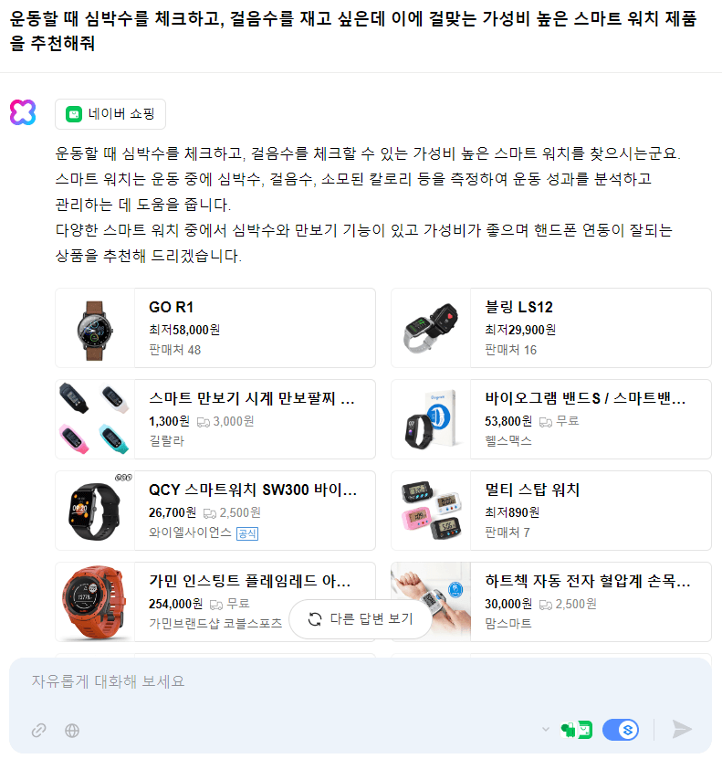 실제 스킬을 활성화해서 대화를 진행해 봤습니다. 정확한 질문을 해야 원하는 답변을 얻을 수 있다는 점을 한번 인지하고, "운동할 때 심박수를 체크하고, 걸음수를 재고 싶은데 이에 걸맞은 가성비 높은 스마트 워치 제품을 추천해 줘"라고 질문을 했습니다. 클로바 x는 네이버 쇼핑 스킬을 이용해서 원하는 조건에 맞는 제품들을 소개해줍니다. 어떤 조건에 의해 제품을 추천해 주는지 정확하게 알 수는 없지만 눈에 띄는 제품을 클릭해서 들어가 보니 꽤나 쓸만한 제품이었습니다.